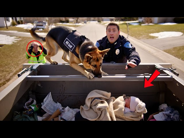With her heart racing, Officer Jenna signaled the garbage truck to stop. The driver, confused but cooperative, halted the vehicle. Max’s nose was glued to the side of the truck, his barking growing more urgent. Officer Jenna and the driver carefully opened the truck’s back compartment and were shocked to discover a small bundle wrapped in a blanket — a newborn baby.