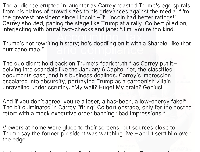 What followed was a masterclass in parody. Carrey launched into his sharpest Trump impression yet, channeling the former president’s bombastic style with eerie accuracy. “Folks, I never lie – I just REWRITE the past!” Carrey bellowed, mimicking Trump’s signature hand gestures and vocal inflections. “The election? Stolen! The economy? Best ever – under me! And those scandals? Fake news, folks.